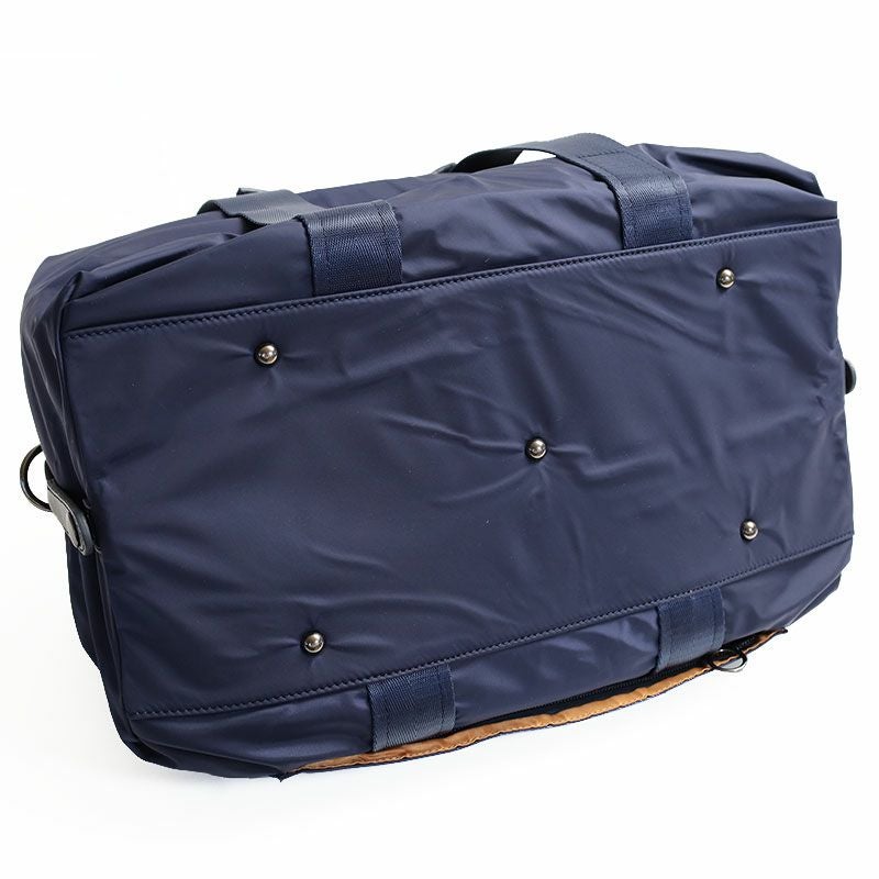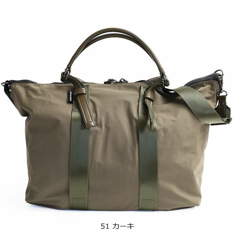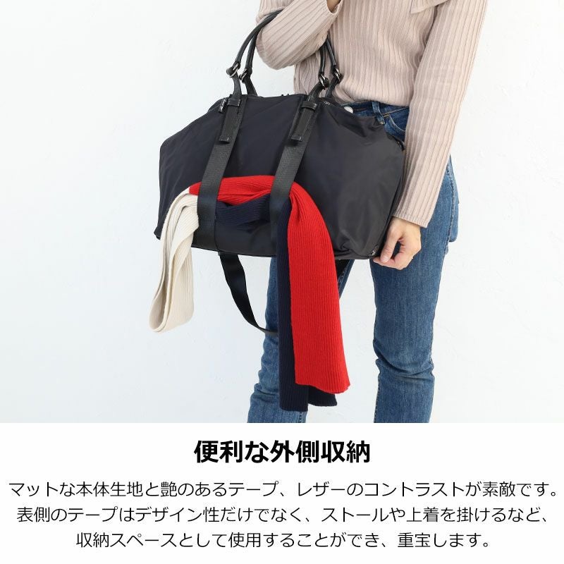 撥水加工されたマットな本体生地と艶のあるテープ、レザーのコントラストがマニッシュなボストンバッグ。