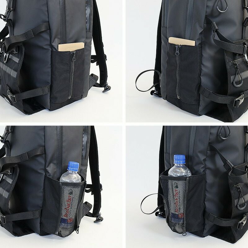 側面のポケットはファスナーを開けることでペットボトルが収納可能なメッシュポケットになる2WAY仕様です。