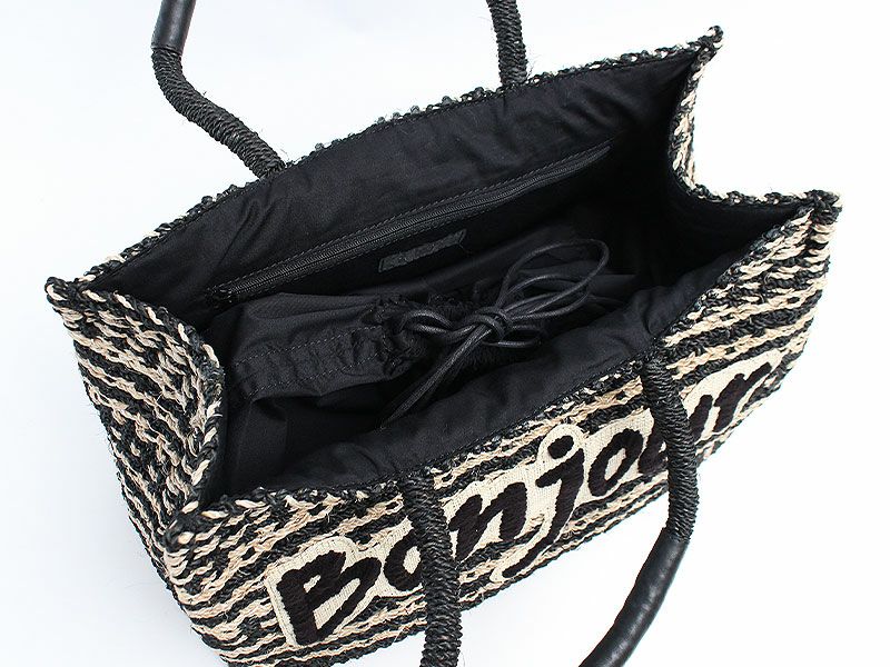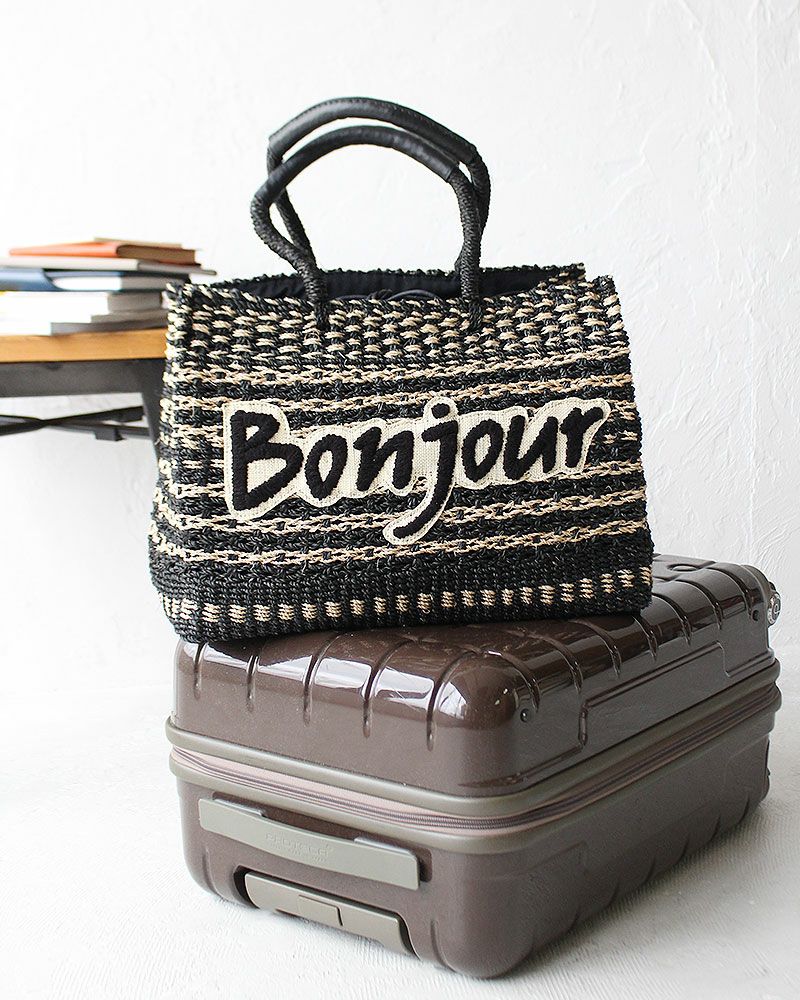 Bonjourの刺繍がキュートなトートバッグです。 ブラックとナチュラルで重くなりすぎず、カゴ素材で季節感もプラスしてくれます。 シンプルなコーディネートに程よいアクセントを加えてくれるアイテムです。