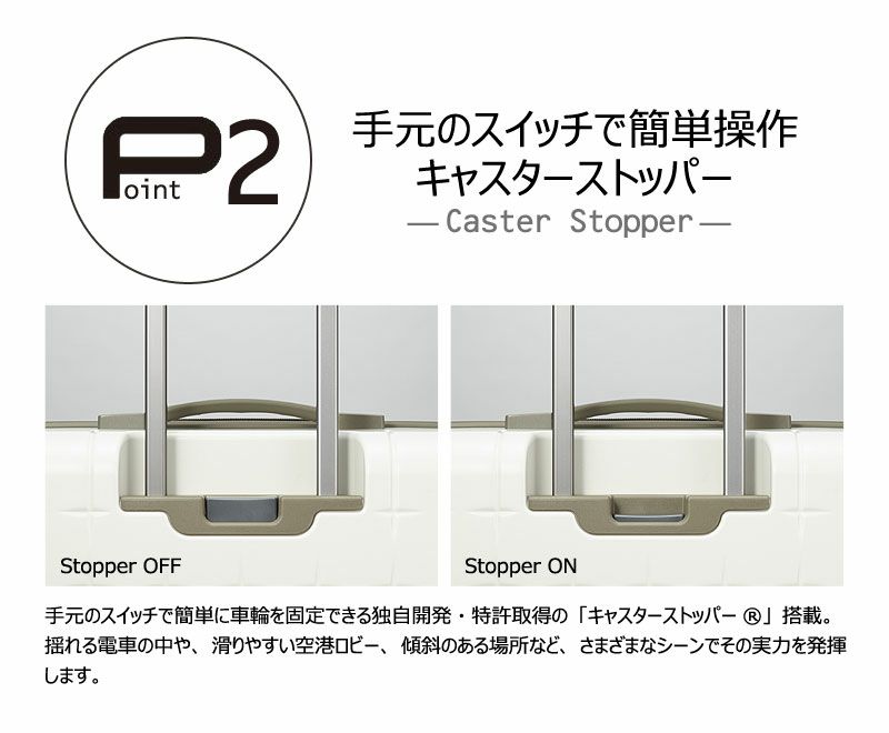 手元のスイッチで簡単に車輪を固定できる独自開発・特許取得の「キャスターストッパー」を新たに搭載。