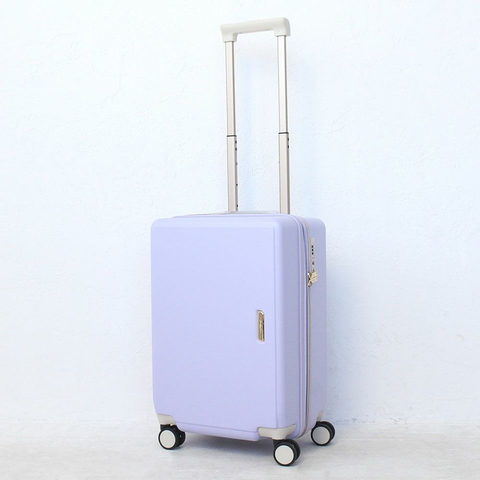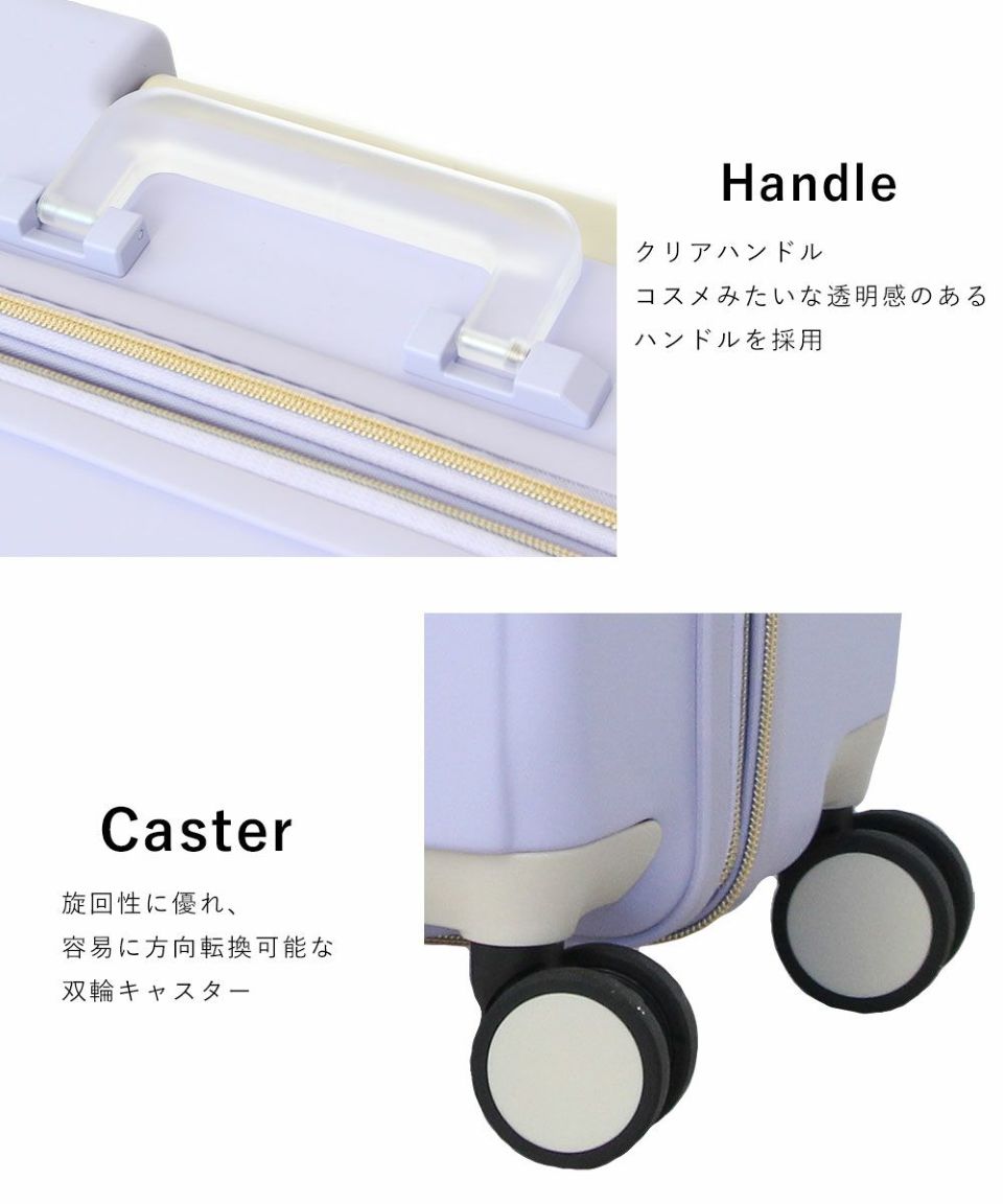 お洒落なニュアンスカラーの本体とクリアハンドルで抜け感のあるデザインに仕上げたスーツケース。