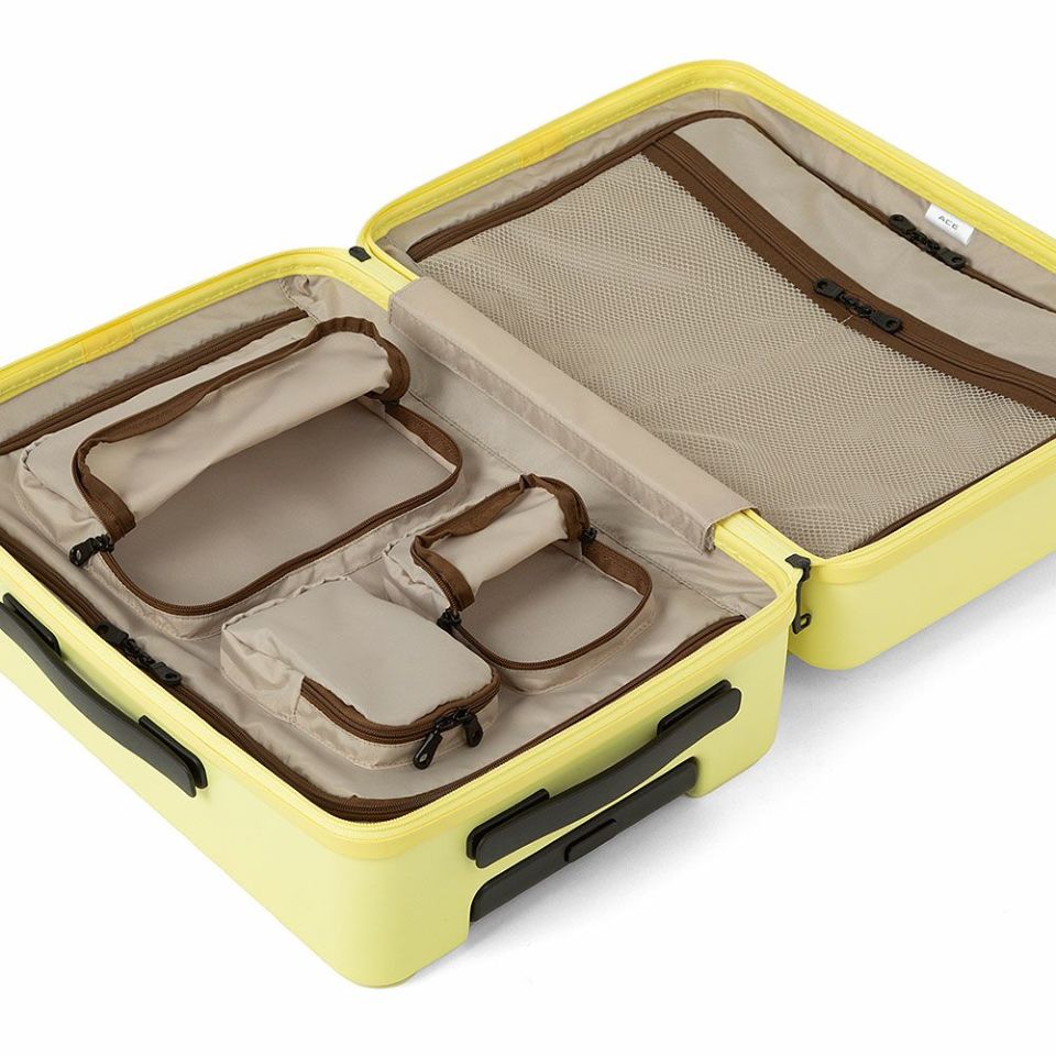 スクエアのシルエットとブライトカラーが目を引くおしゃれなスーツケースシリーズ。