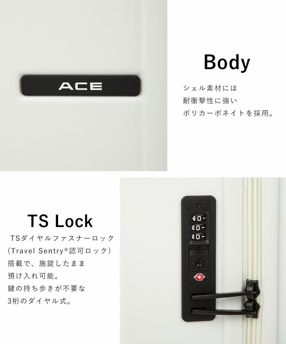●TSダイヤルファスナーロック:TSダイヤルファスナーロック(Travel Sentry(R)認可ロック)搭載で、施錠したまま預け入れ可能。