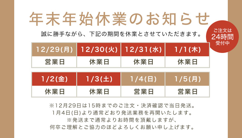 12月30日〜1月3日まで は発送業務をお休みさせていただきます。