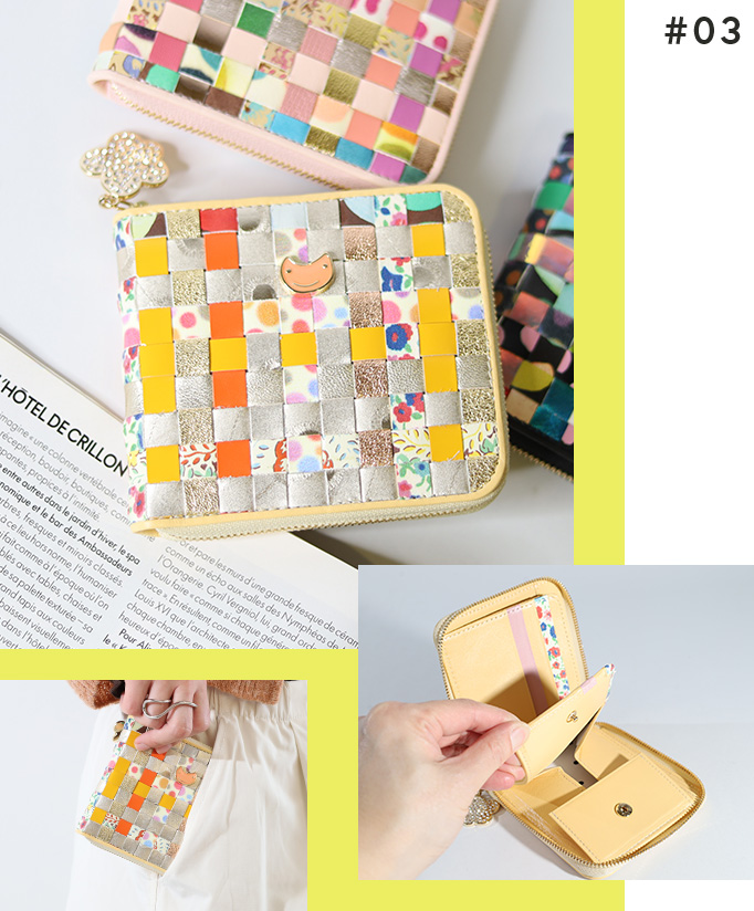 ドットや花柄のレザーを編み込んだ、華やかさが魅力の二つ折り財布。